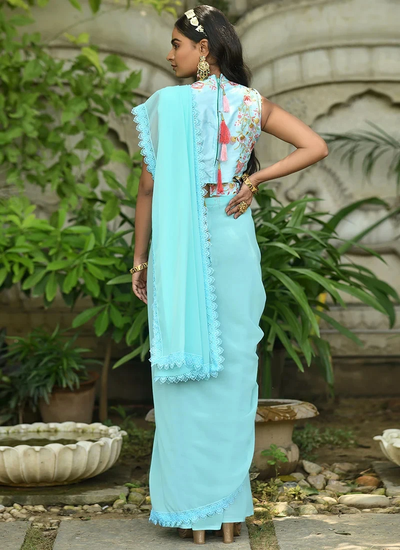 Comes with unstitched blouse fabric. To have the blouse stitched, please select the custom tailoring options. Blouses with elaborate patterns and colors are used for photo-shoot. Color and pattern of the blouse might not be as shown in the image.