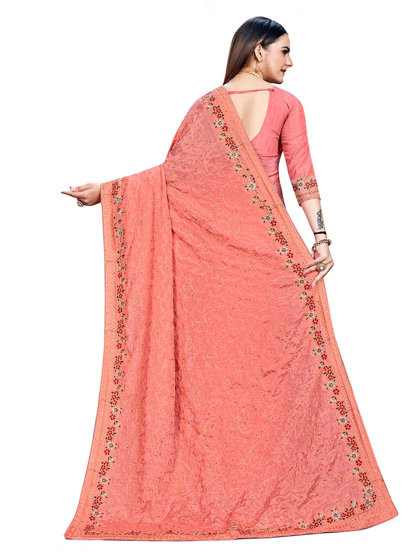 Embroidery And Stone Work Peach Color Chinon Saree Festive Wear