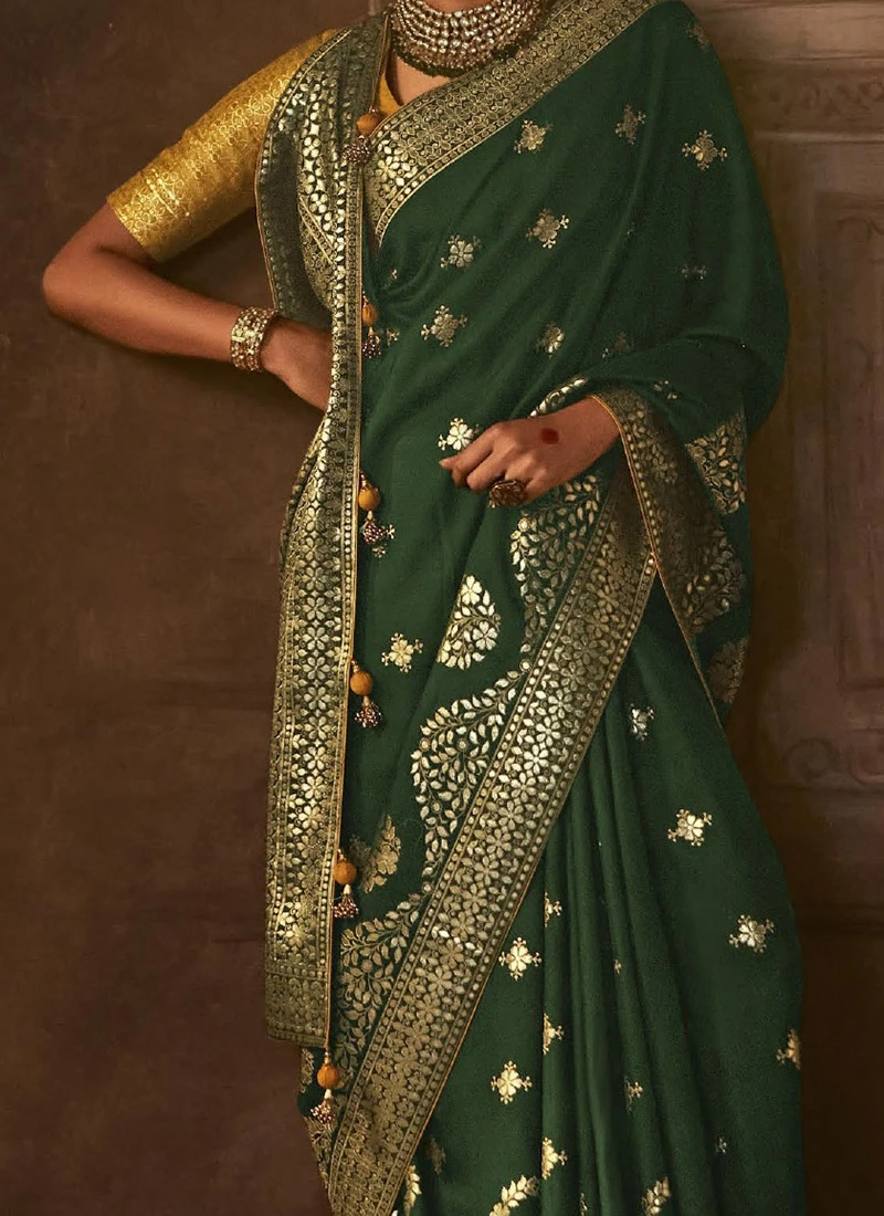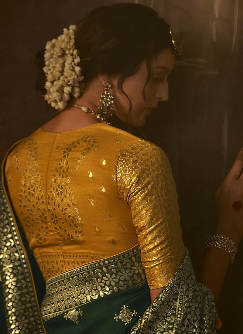 The pallu or the decorative end piece of the saree is adorned with elaborate zari borders and artistic patterns making it a focal point of the ensemble. The accompanying blouse piece complements the saree perfectly either in a matching green hue or a contrasting colour allowing the wearer to customize their look according to their preference.