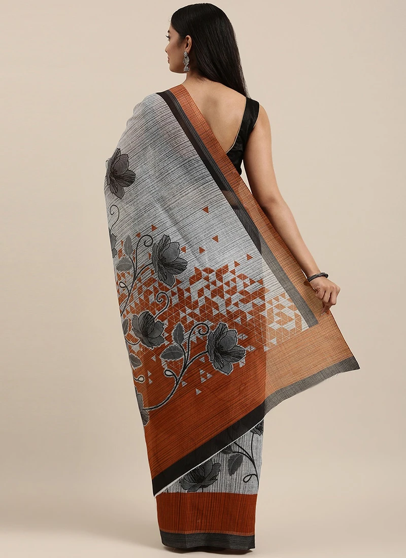 Grey Linen Cotton Saree Festive Wear