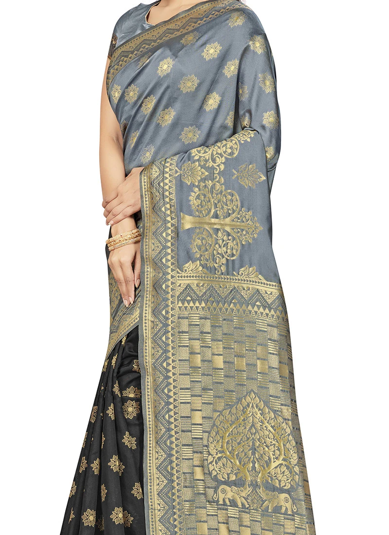 Grey N Black Color Woven Work Banarasi Silk Saree Festive Wear