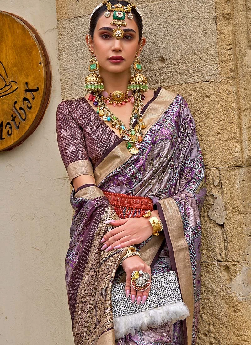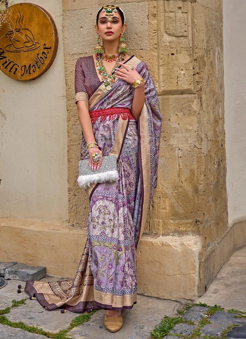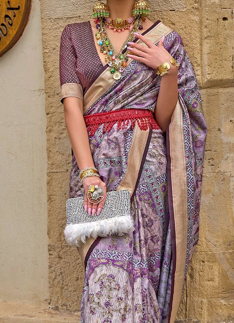 The saree features a mesmerizing lavender hue reminiscent of blooming fields under a twilight sky. The soft pastel tone adds a touch of sophistication making it suitable for both day and evening wear. The intricate prints on the saree showcase a harmonious fusion of artistic patterns ranging from delicate florals to intricate geometric motifs. Each design is meticulously crafted reflecting the skill and creativity of the artisans.