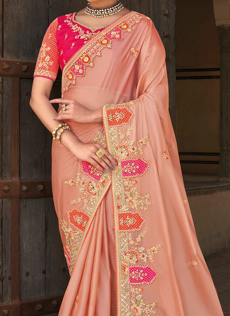 Peach Color Thread Embroidery Banarasi Silk Saree Party Wear