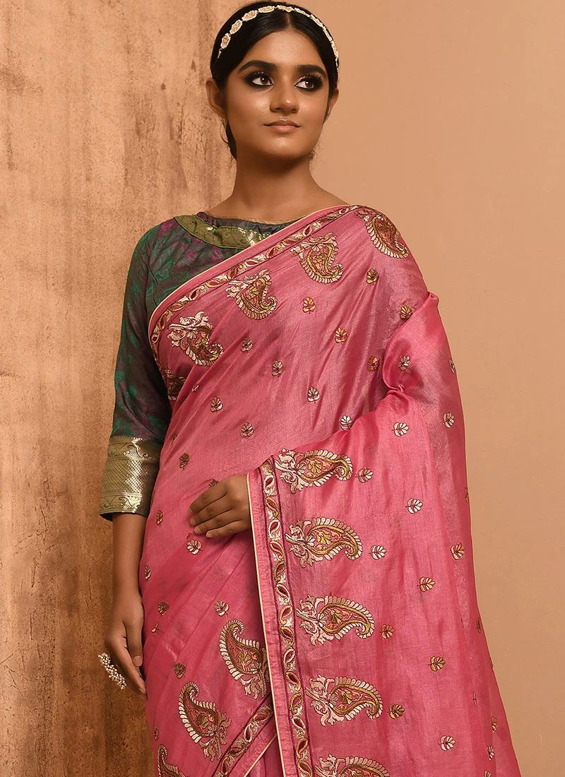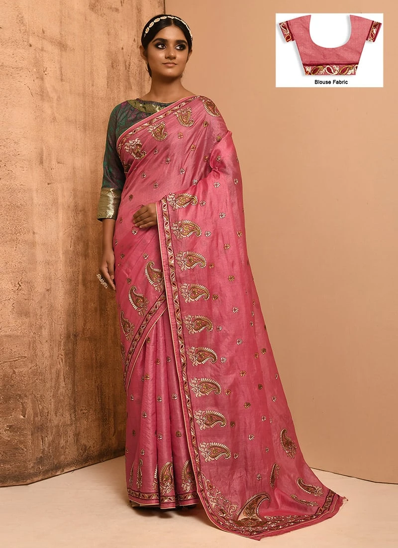Pink Pure Tussar Silk Embroidery Work Saree Festive Wear