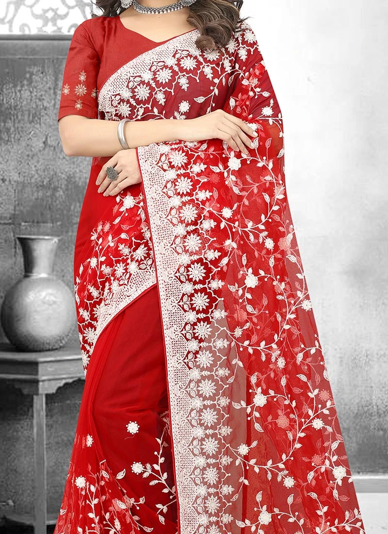 In summary the Red Net Embroidered Saree is a masterpiece of craftsmanship blending traditional artistry with contemporary style. Its vibrant red colour intricate embroidery and luxurious fabric make it a timeless choice for women who appreciate the beauty of Indian ethnic wear. Whether worn at weddings parties or festive celebrations this saree ensures that the wearer stands out with poise and confidence leaving a lasting impression on everyone who beholds her beauty.