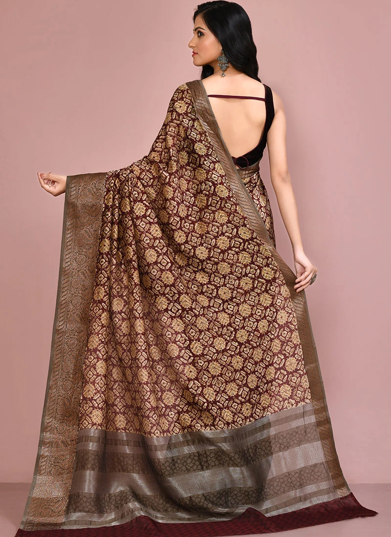 Comes with unstitched blouse fabric. To have the blouse stitched, please select the custom tailoring options. Blouses with elaborate patterns and colors are used for photo-shoot. Color and pattern of the blouse might not be as shown in the image.