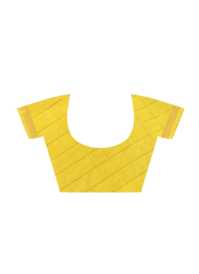 The Yellow Blended Cotton Sari is a canvas of intricate design and expert craftsmanship. Its design showcases a harmonious blend of traditional and contemporary elements. The body of the sari features a subtle texture or weave that adds depth and character to the fabric. This serves as an ideal backdrop for the vivid eyecatching border and pallu.